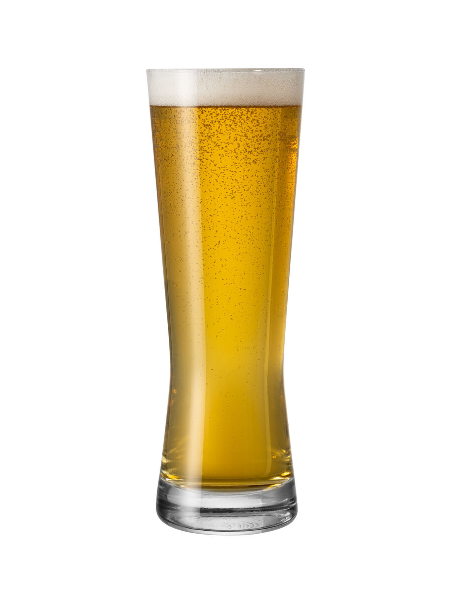 This tall, biconic beer glass features a slimmer middle that widens toward the top, creating a distinctive and elegant silhouette.