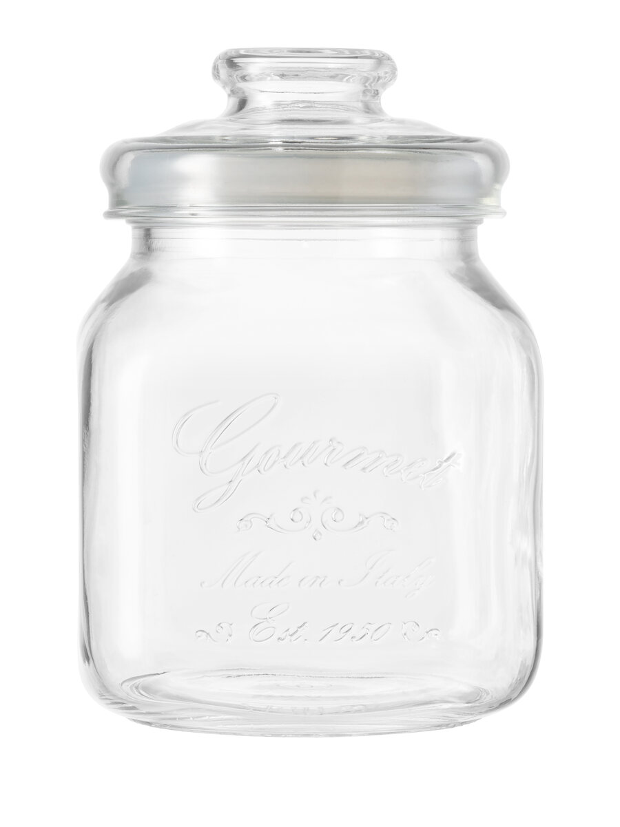 Hermetic container jar made of extra-clear glass with a brimful capacity of 3.1 liters.
