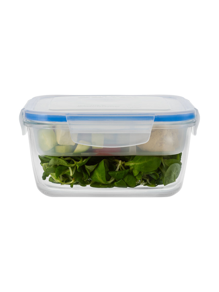 140 cl square container in extra-clear glass, equipped with a practical plastic tray divided into sections – perfect for meals on the go. Equipped with a transparent freshness-sealing plastic lid featuring a blue gasket and four snap-lock flaps. Leakproof and convenient for takeaway.