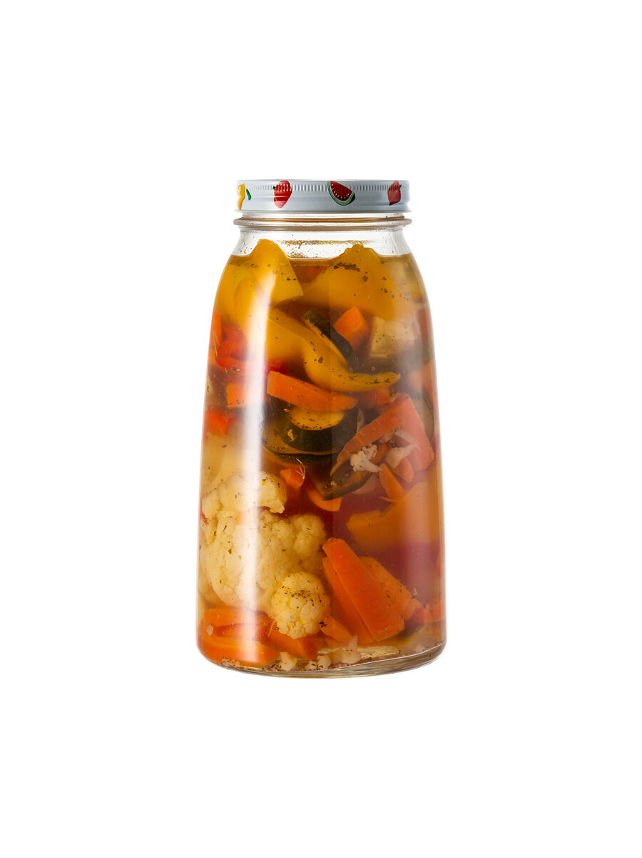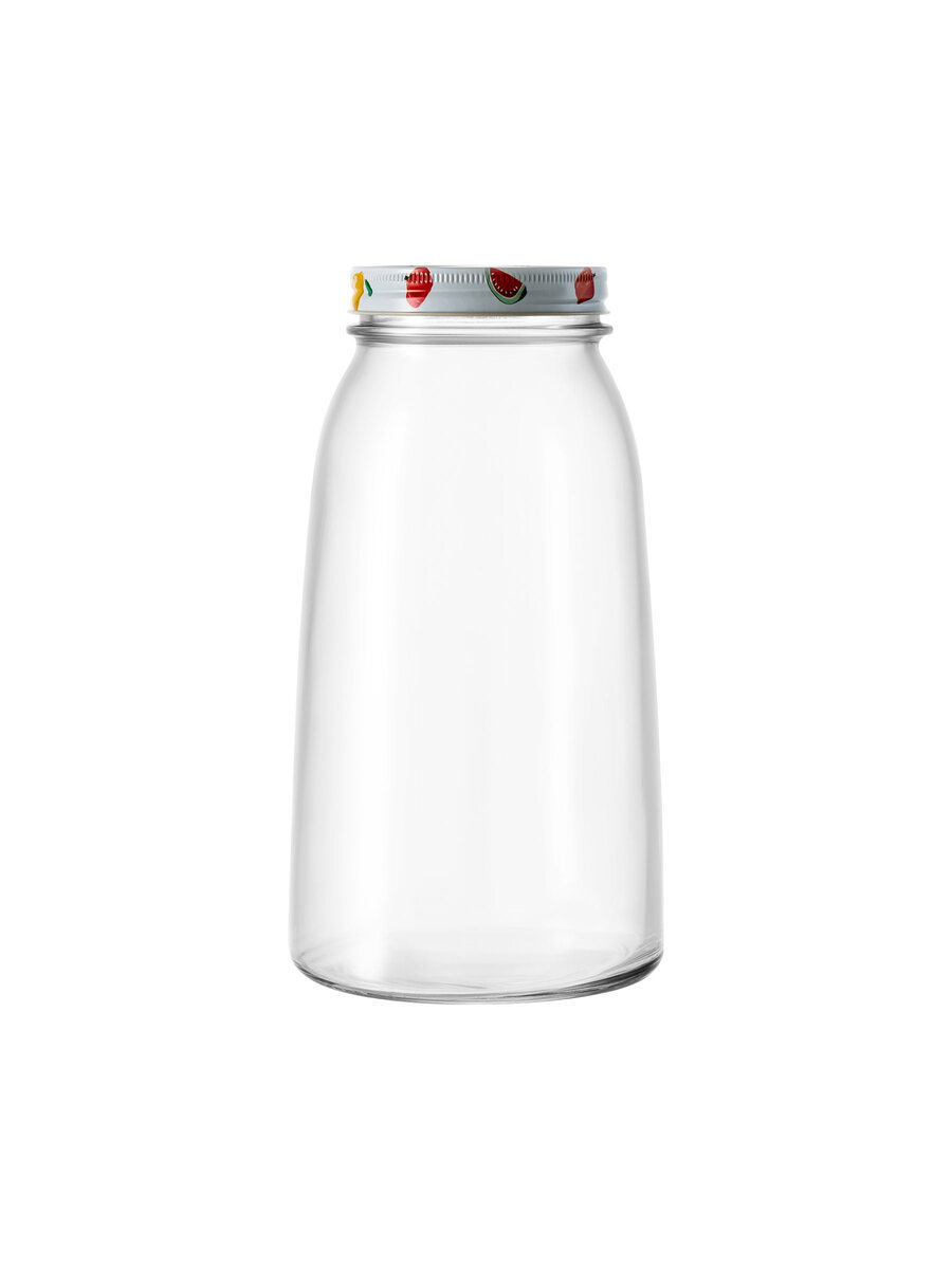 Extra-clear glass jar with a capacity of 2 liters, filled to the brim, featuring a 4-seasons metal screw-cap with airtight seal.
