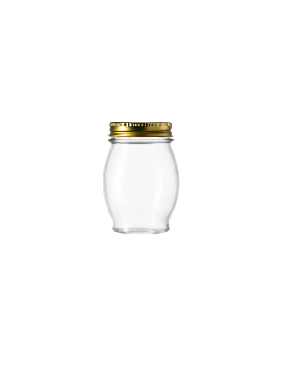 Extra-clear glass jar with a 0.390 L brimful capacity, featuring a hermetically sealing metal lid with an inner rubber coating.