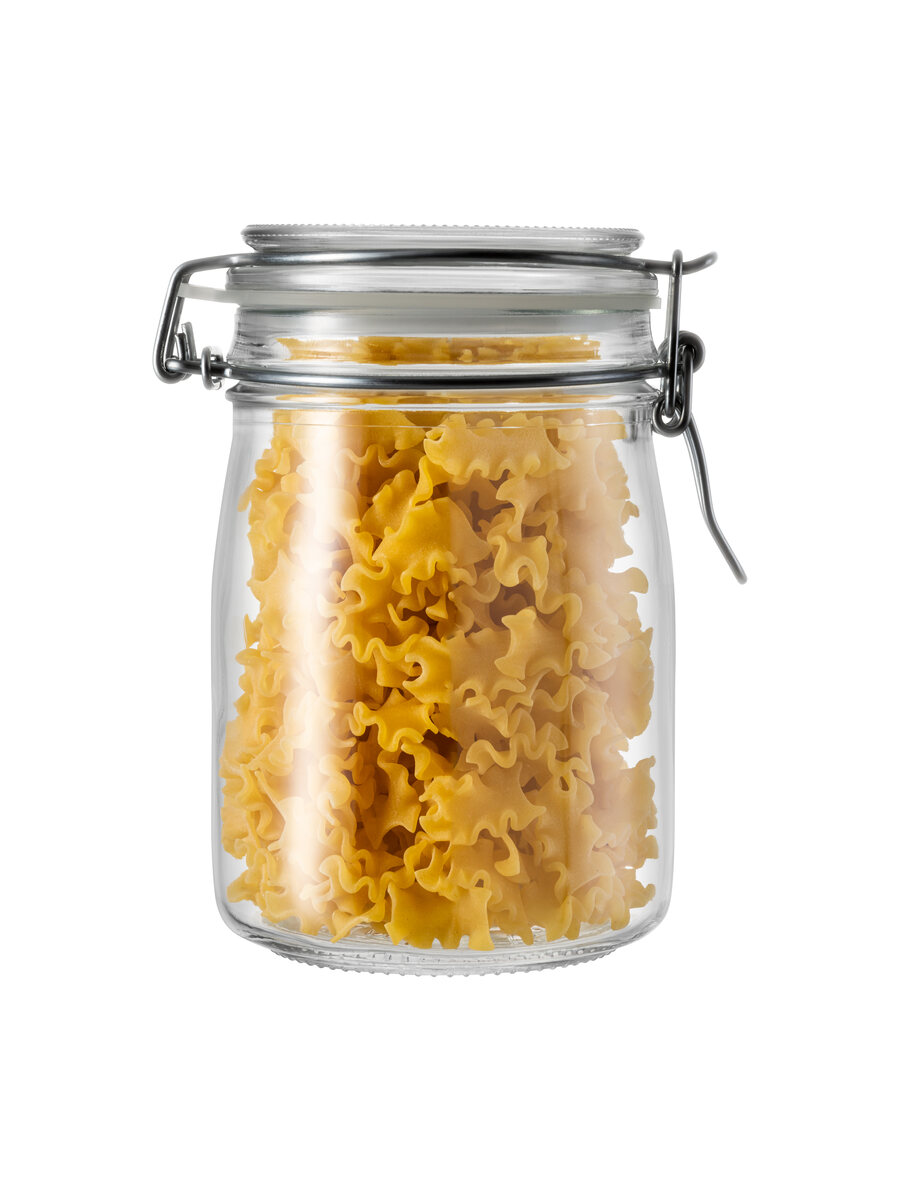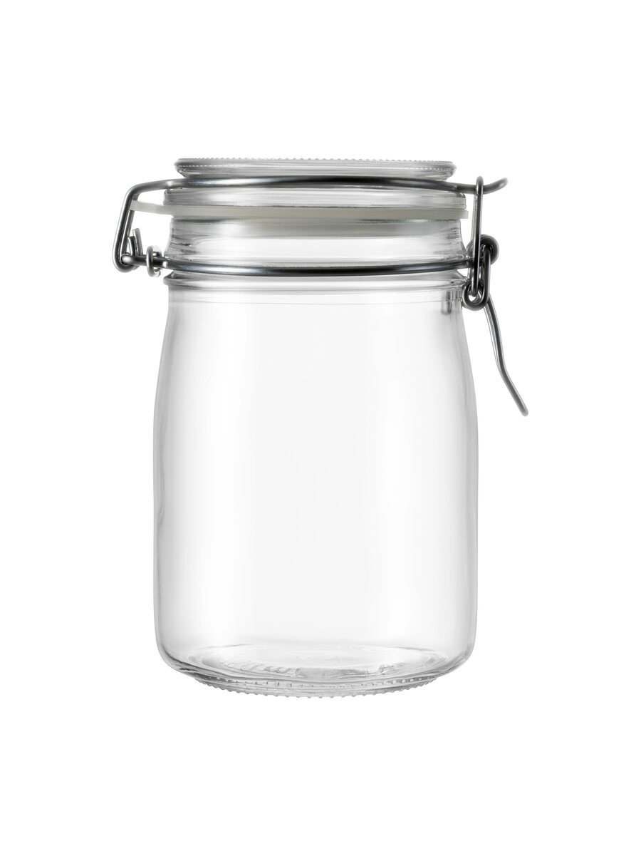1 L_35 Oz 50 cl clear glass jar with a lid featuring a practical ring, seal, and airtight metal clasp.