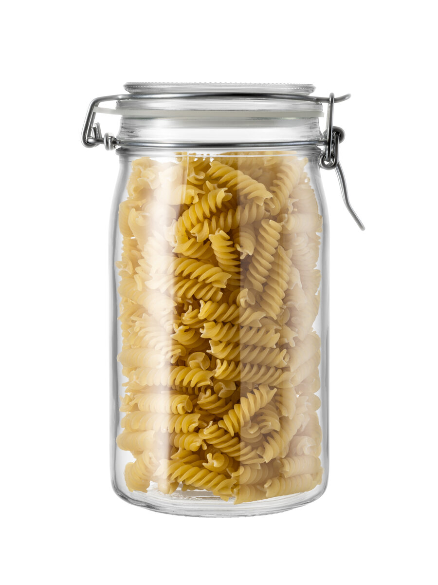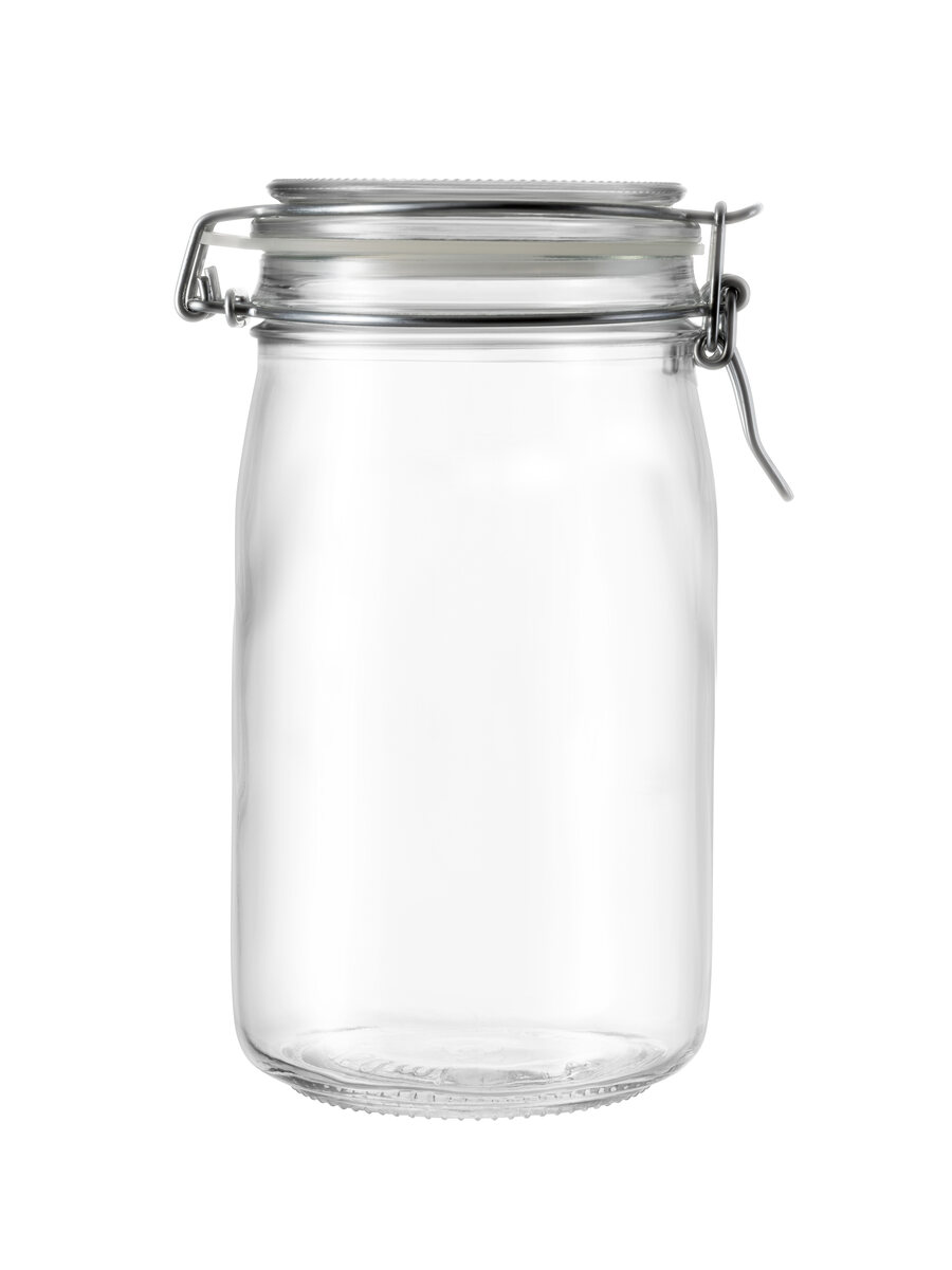 1,5 L_53 Oz c50 cl clear glass jar with a lid featuring a practical ring, seal, and airtight metal clasp.