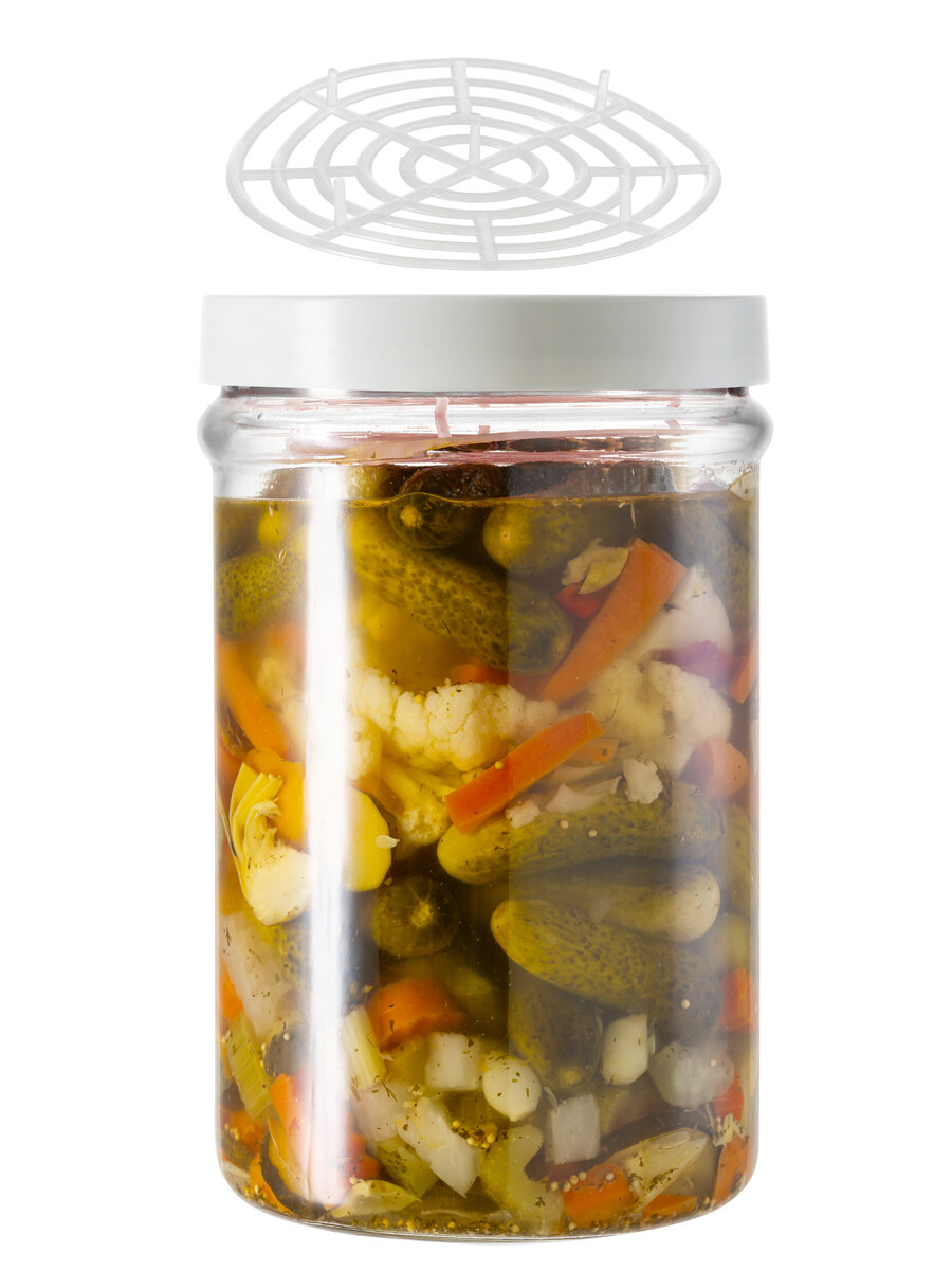 The container is equipped with a press-down plastic tool that helps to preserve pickles or in oil food.