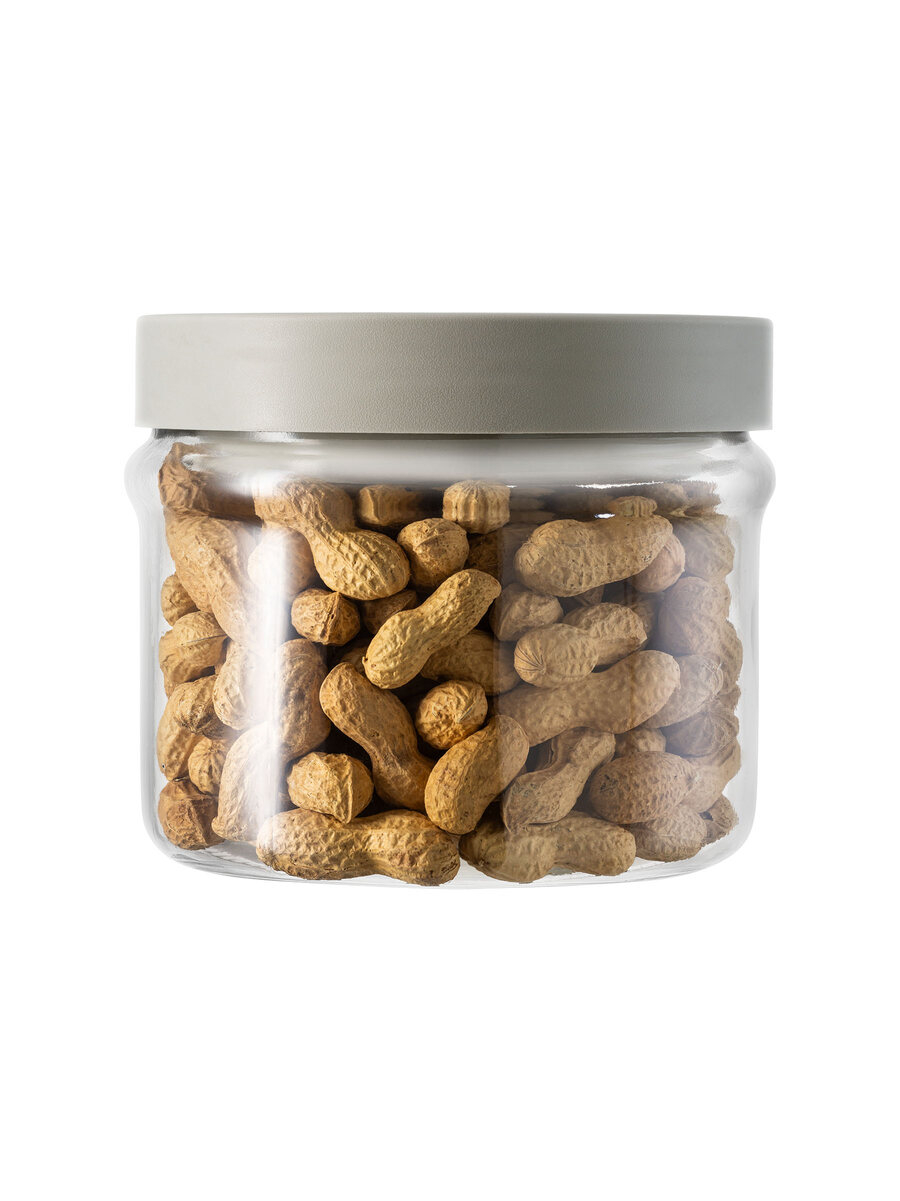 The jar comes with a grey plastic screw cap featuring a practical handle.