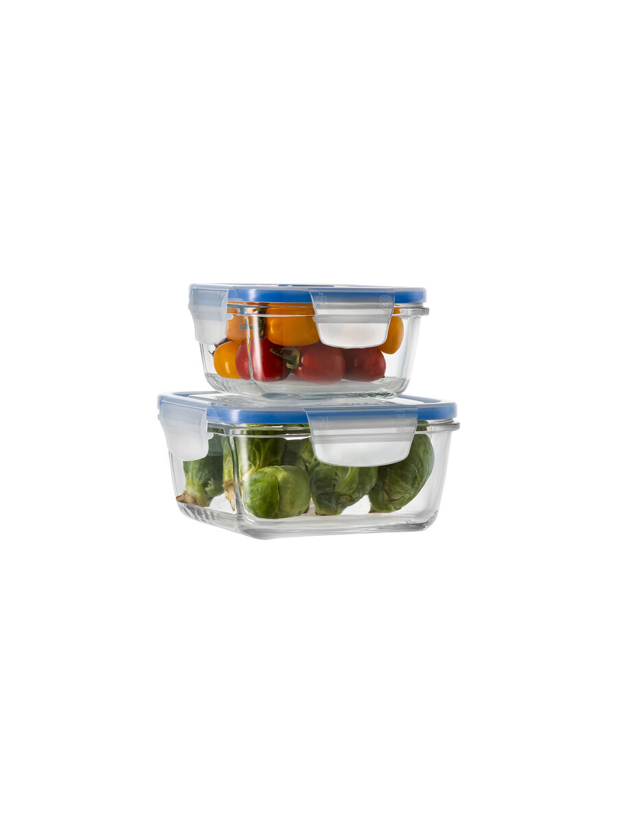 Set of 2 square glass food containers with automatic valve ideal for storing food in the fridge and freezer (down to -20°C).