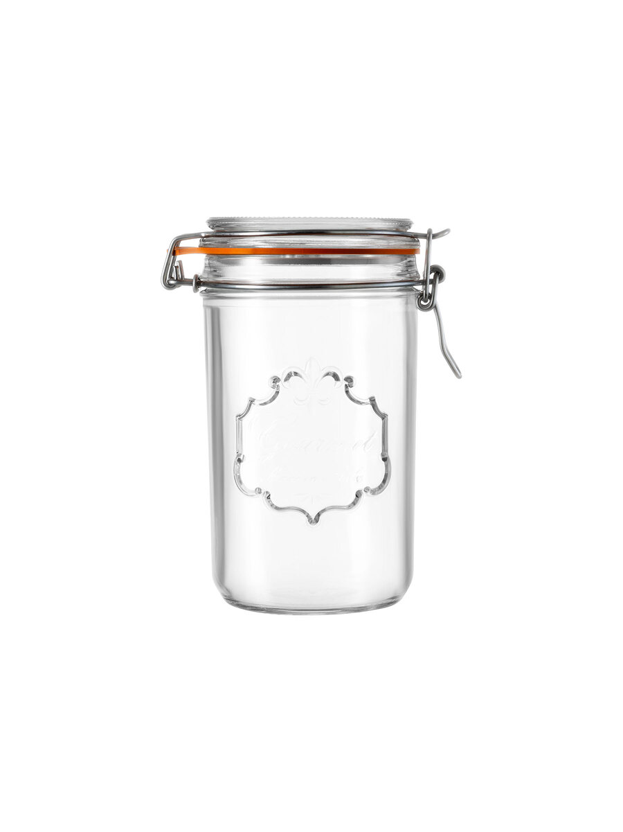 Vaso cilindrico da 75cl di capacità in vetro extra trasparente con coperchio, guarnizione e chiusura ermetica metallica.