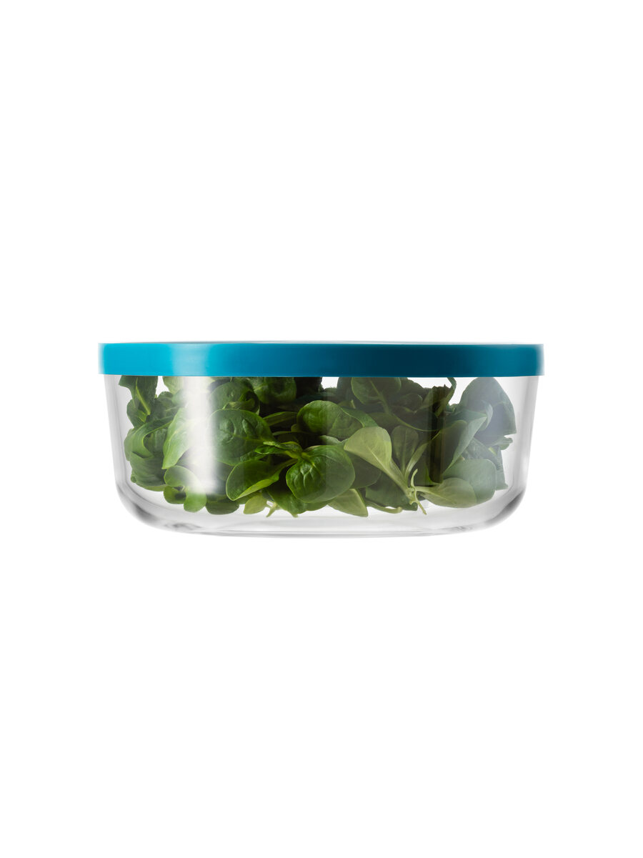 Contenitore per alimenti in vetro extra trasparente di alta qualità da 250cl e 21,5cm di diametro con coperchio in plastica alimentare senza BPA (disponibile in tre varianti colore).