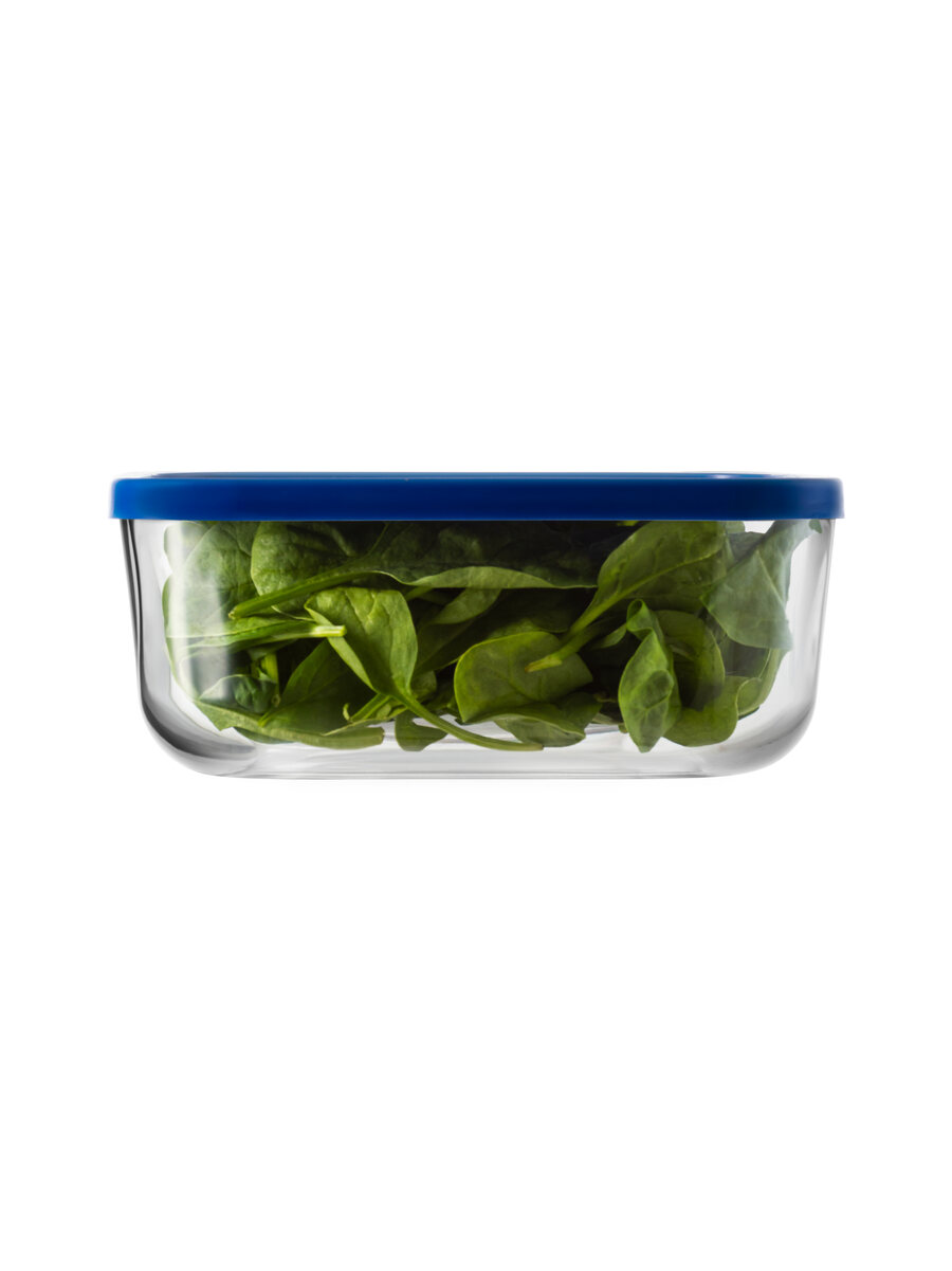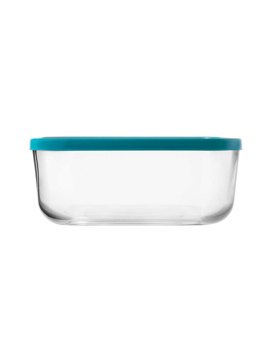Contenitore quadrato per alimenti in vetro extra trasparente da 320cl e lungo 22 cm con coperchio in plastica alimentare senza BPA (disponibile in 3 colorazioni).