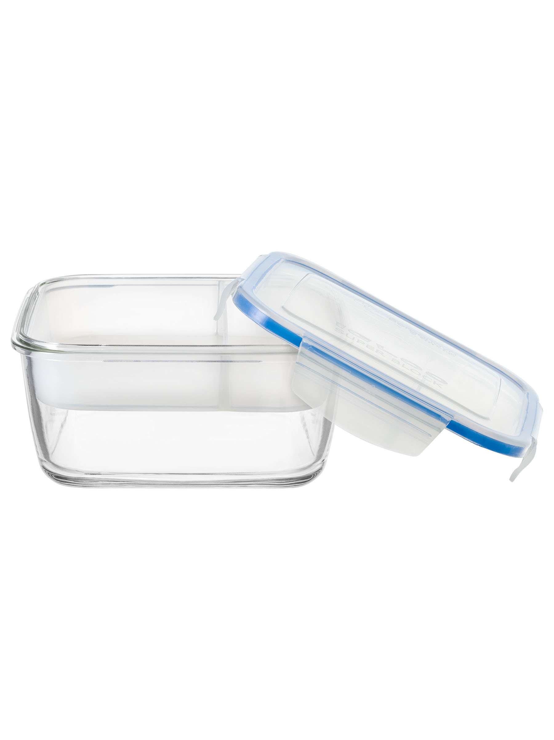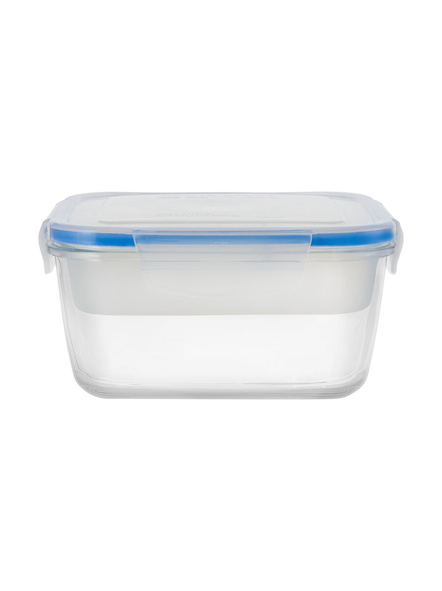 Contenitore quadrato da 140cl in vetro extra trasparente dotato di una pratica vaschetta in plastica divisa in sezioni perfetta per il pranzo fuori casa . Coperchio salva-freschezza in plastica trasparente con guarnizione blu e alette di chiusura sui quattro lati, antigoccia e pratico anche per il takeaway.