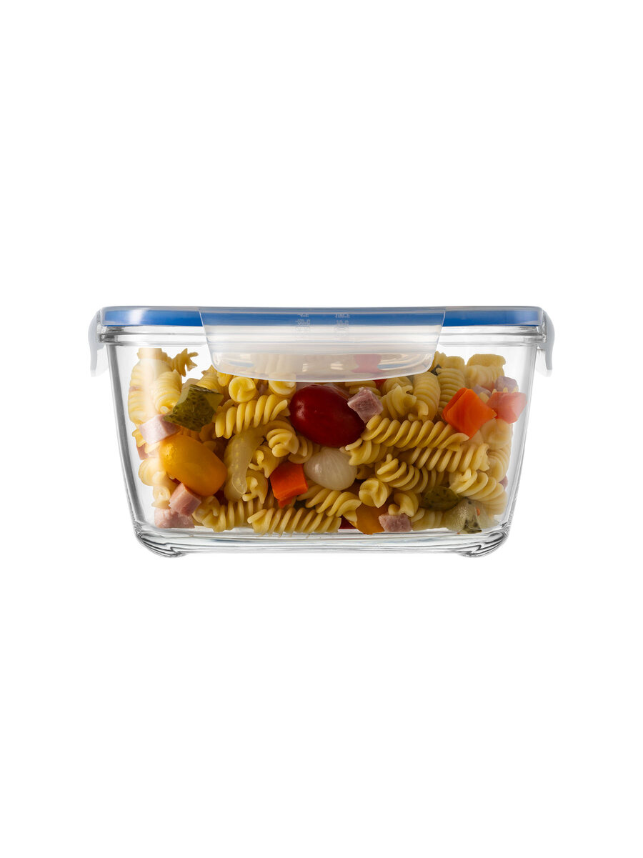 Contenitore quadrato da 260cl in vetro extra trasparente per la conservazione degli alimenti in frigorifero e in freezer (fino a -20°C). Coperchio salva-freschezza in plastica trasparente con guarnizione blu e alette di chiusura sui quattro lati, antigoccia e pratico anche per il takeaway.