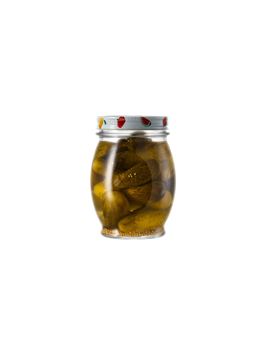 Vasetto in vetro extra trasparente da 0,780 L di capacità raso bocca, con tappo-capsula metallico internamente gommato a chiusura ermetica.