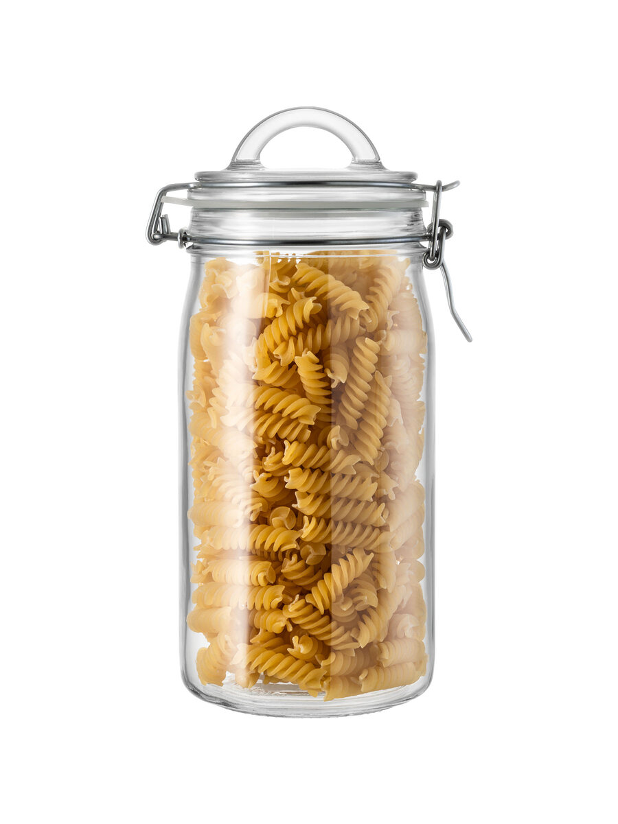 Vaso in vetro trasparente da 150 cl con coperchio dotato di pratico anello, guarnizione e chiusura ermetica in metallo.