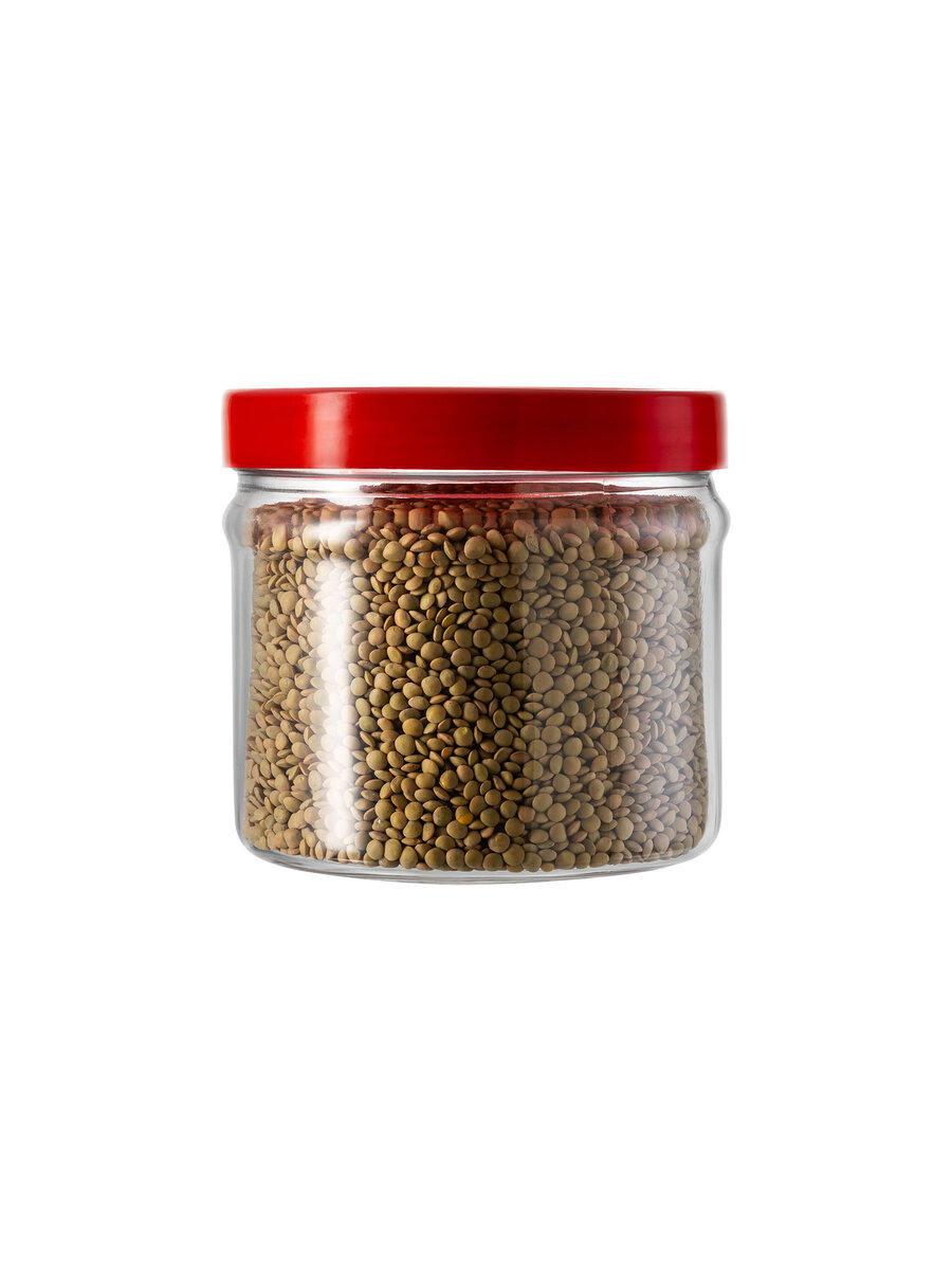 Barattolo in vetro extra trasparente da 1,15L di capacità rasobocca, con tappo a vite in plastica rossa.
