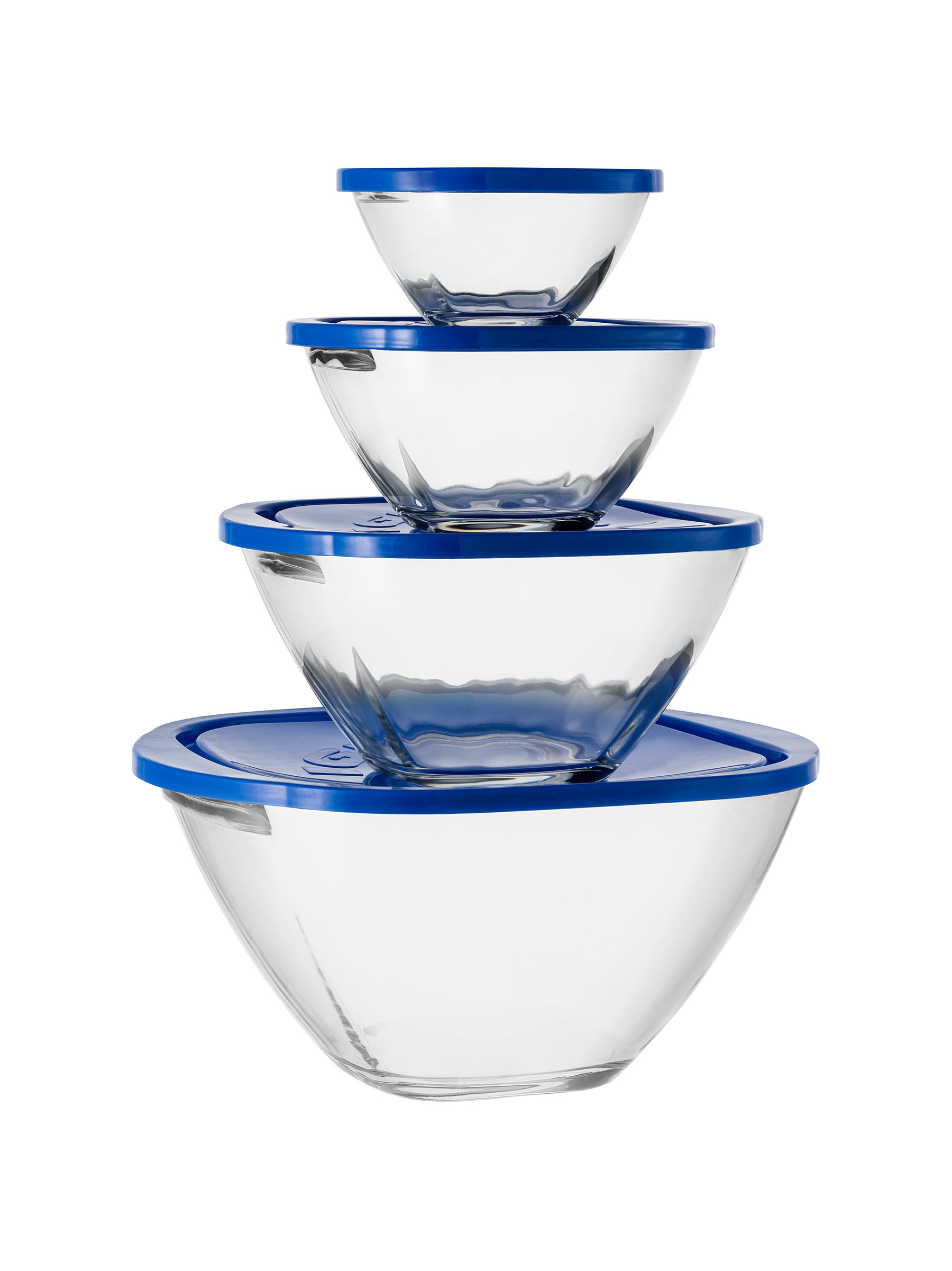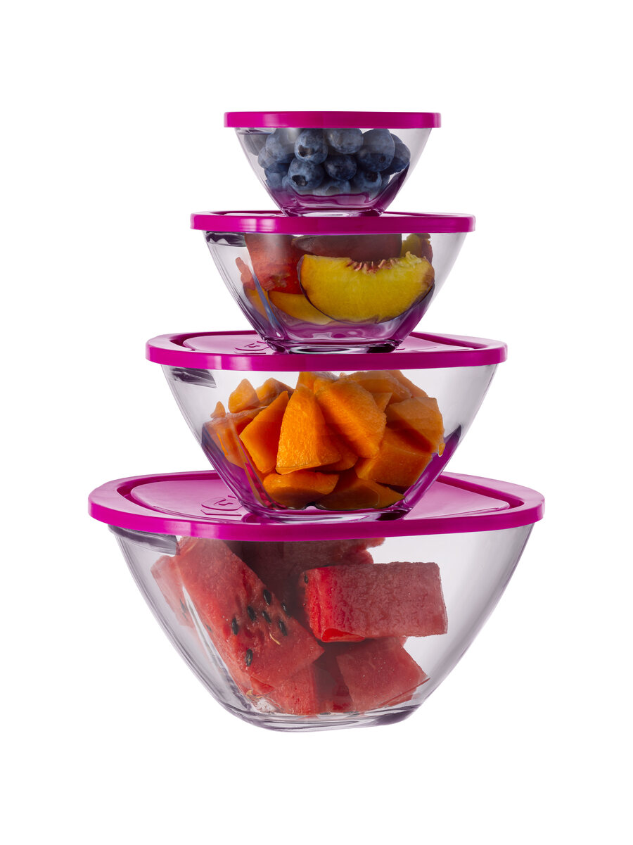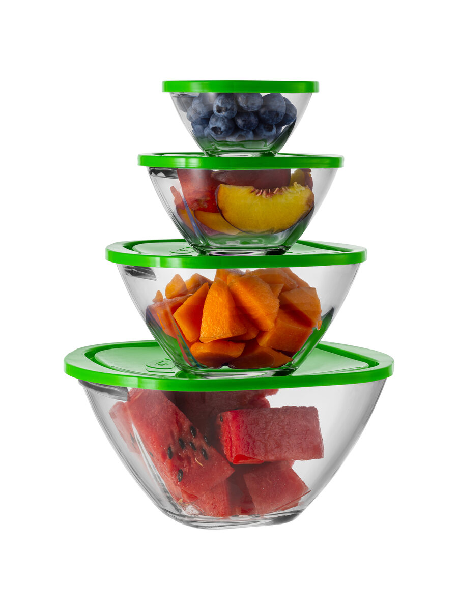 Set da 4 coppe con manici in vetro extra trasparente di prima qualità in 4 differenti misure per la conservazione degli alimenti in frigorifero e in freezer. Il set si compone di coperchio in plastica alimentare senza BPA. (disponibile in 3 colori).
