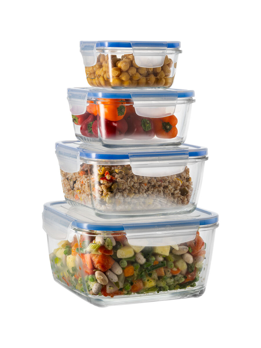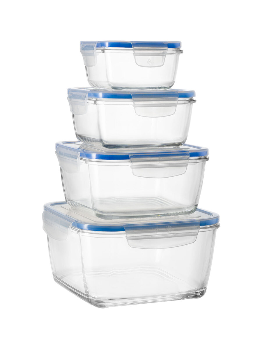 Set da 4 contenitori quadrati in vetro extra trasparente di alta qualità in tre differenti misure per la conservazione degli alimenti in frigorifero e in freezer (fino a -20°C). Coperchio salva-freschezza in plastica trasparente con guarnizione blu e alette di chiusura sui quattro lati, antigoccia e pratico anche per il takeaway.