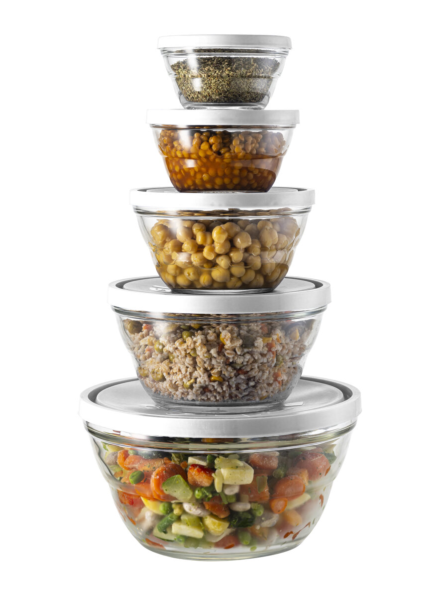 Set da 5 coppe-contenitori tonde in vetro extra trasparente in cinque differenti misure per la conservazione degli alimenti in frigorifero e in freezer con coperchio in plastica alimentare senza BPA. IPerfetto per conservare gli alimenti in frigorifero e freezer (fino a -20°C).