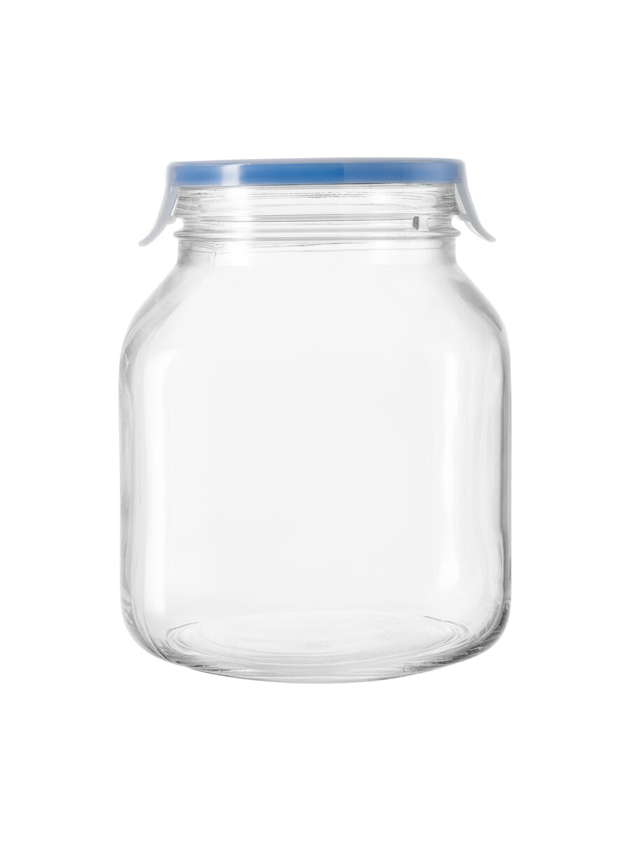 Vaso contenitore ermetico in vetro extra trasparente da1,7 litri rasobocca di capacità. Vetro 100% made in italy di prima qualità,coperchio salvafreschezza in plastica trasparente con alette di chiusura sui due lati e guarnizione di colore blu. 100% made in Italy. No BPA.