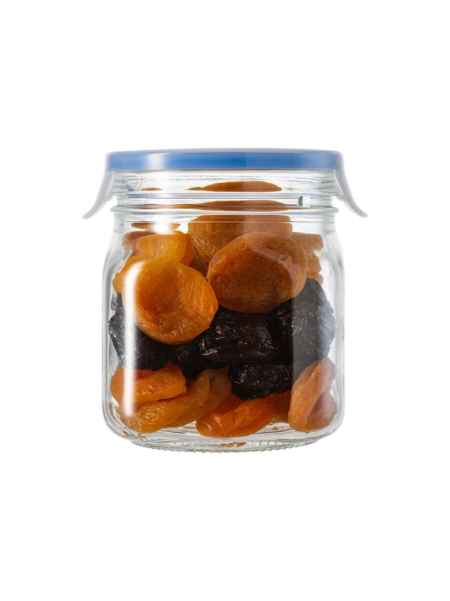 Vaso contenitore ermetico in vetro extra trasparente da 0,75 litri di capacità e 0,85 litri rasobocca. Vetro 100% made in italy di prima qualità, coperchio salvafreschezza in plastica trasparente con alette di chiusura sui due lati e guarnizione di colore blu. No BPA.