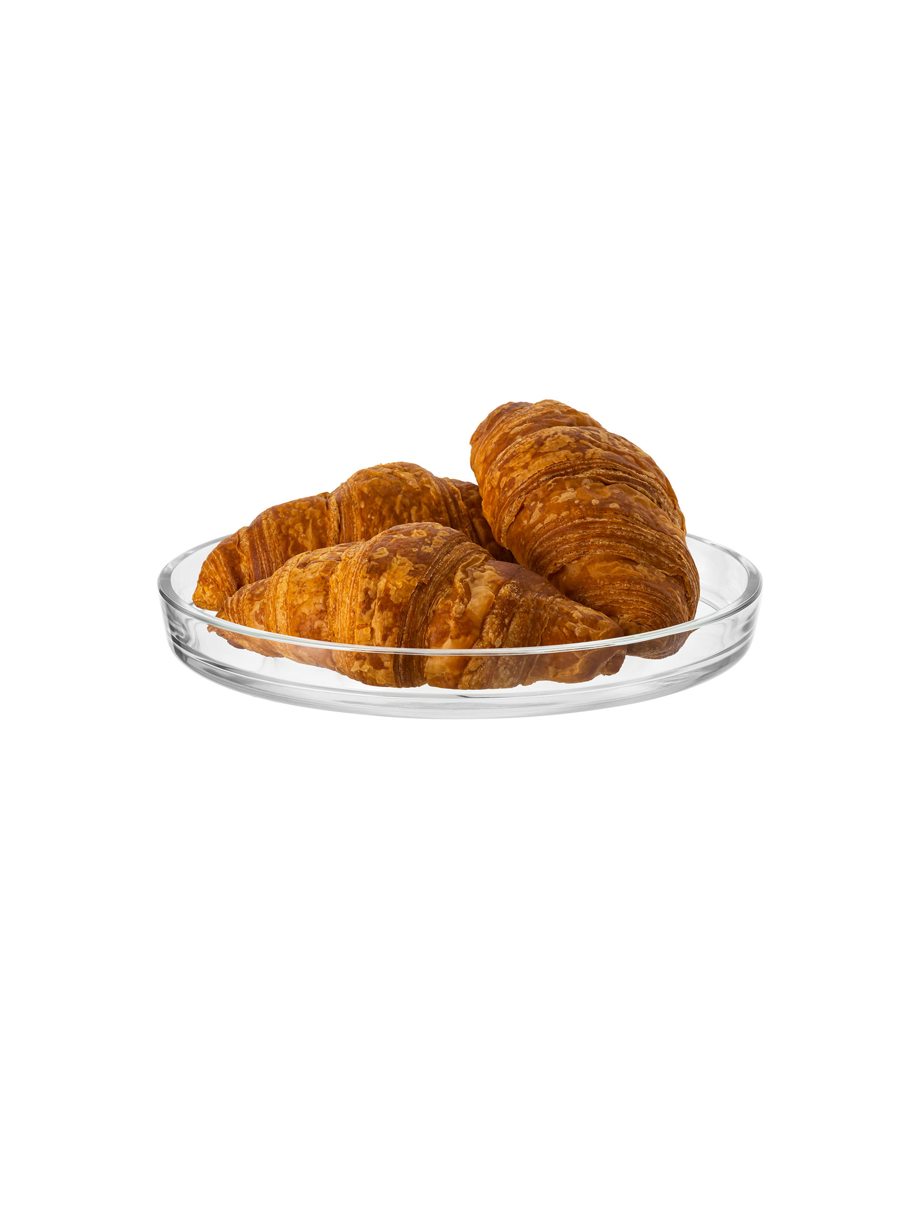 Piatto tondo in vetro extra trasparente da 22cm di diametro con bordo esterno rialzato.